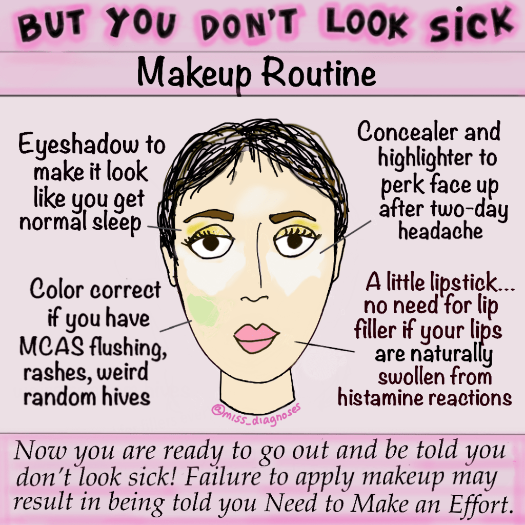 The cartoon is similar to my makeup routine (as an MCAS patient with rosacea)—it’s not meant to represent anything universal among people with chronic illnesses (although perhaps the need for extra concealer is universal). I wanted to add extra stuff like “contour swollen face “and “draw in outer eyebrow if thyroid is broken” but I didn’t have enough space.